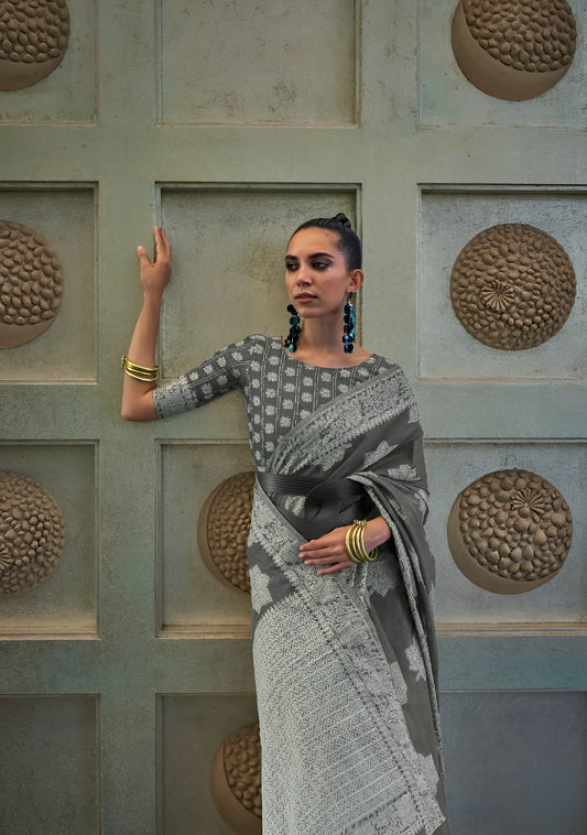 EKKTARA Saree For Women Lava Grey Chikankari Weaving Saree