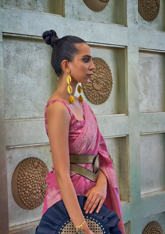 EKKTARA Saree For Women Carnation Pink Linen Silk Chikankari Border Weaving Saree
