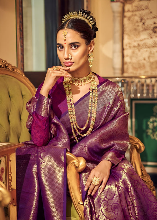 EKKTARA Saree For Women Purple Colour Kanjivaram Zari Silk Saree With Unstitched Blouse
