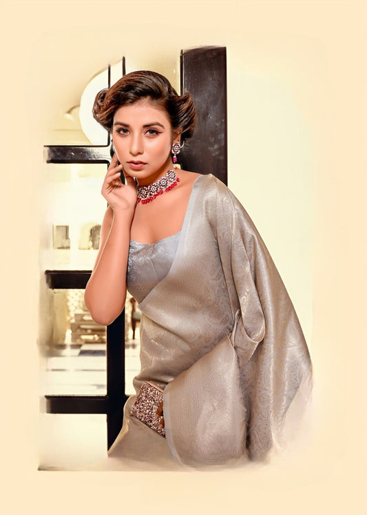EKKTARA Saree For Women Silver Colour Kanjivaram Soft Silk Saree With Unstitched Blouse