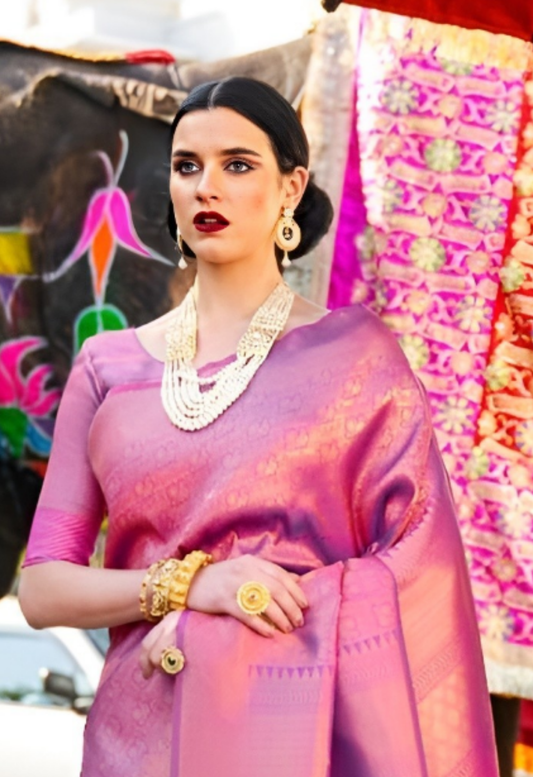 EKKTARA Saree For Women Rose Gold Colour Kanjivaram Soft Silk Saree With Unstitched Blouse