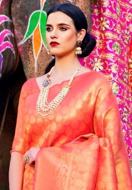 EKKTARA Saree For Women Peach Colour Kanjivaram Soft Silk Saree With Unstitched Blouse