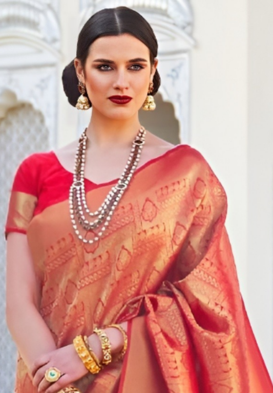 EKKTARA Saree For Women Sunny Red Colour Handloom Weaving Kanjivaram Saree With Unstitched Blouse