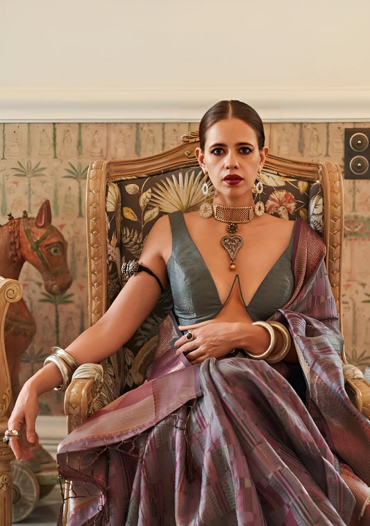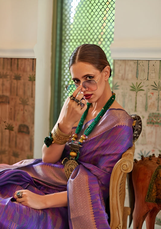 EKKTARA Saree For Women Two Tone Organza Purple Colour Handloom Weaving Silk Saree With Unstitched Blouse