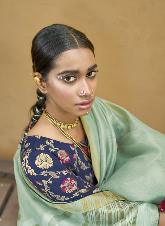 EKKTARA Saree For Women Sea Green Zari Organza Weaving Saree
