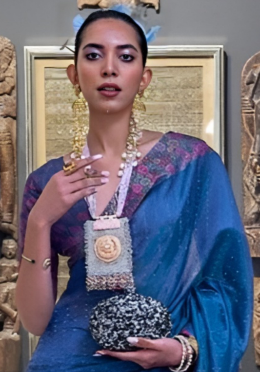 EKKTARA Saree For Women Two Tone Organza Marine Blue Colour Handloom Weaving Silk Saree With Unstitched Blouse