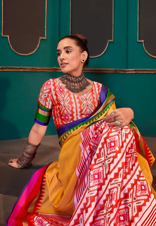 EKKTARA Saree For Women Peach Colour Pure Silk Designer Patola Saree With Unstitched Blouse