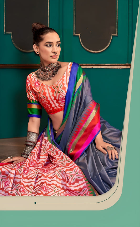 EKKTARA Saree For Women Grey Colour Pure Silk Designer Patola Saree With Unstitched Blouse
