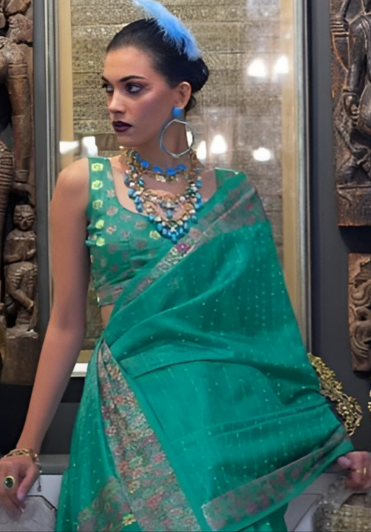 EKKTARA Saree For Women Two Tone Organza Marine Sea Green Colour Handloom Weaving Silk Saree With Unstitched Blouse