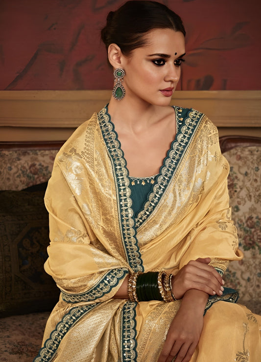 EKKTARA Saree For Women Golden Yellow Colour Dola Silk Saree With Embroidery Work Unstitched Blouse