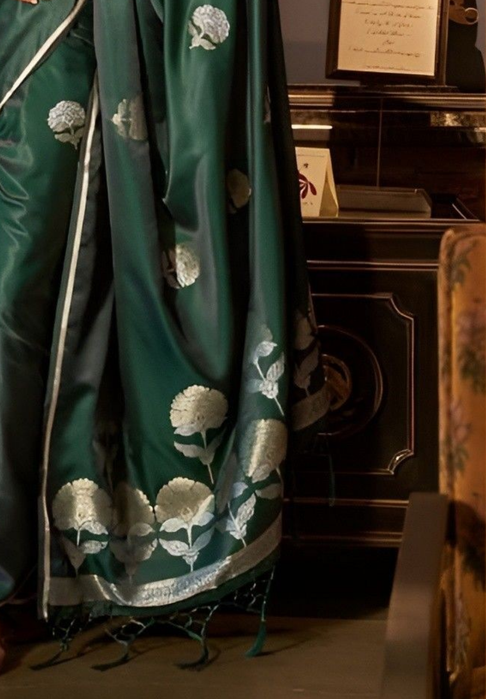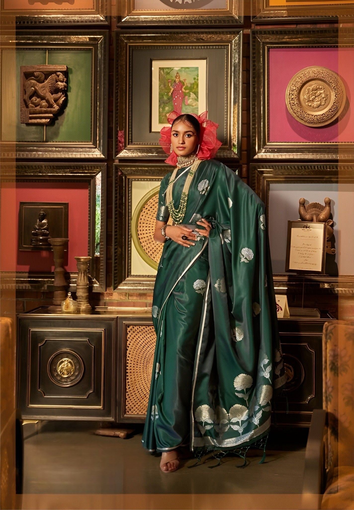 EKKTARA Saree For Women Pine Green Satin Silk Handloom Weaving Saree