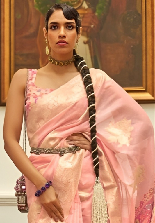 EKKTARA Saree For Women Light Pink Colour Organza Sari Weaving Saree With Designer Unstitched Blouse