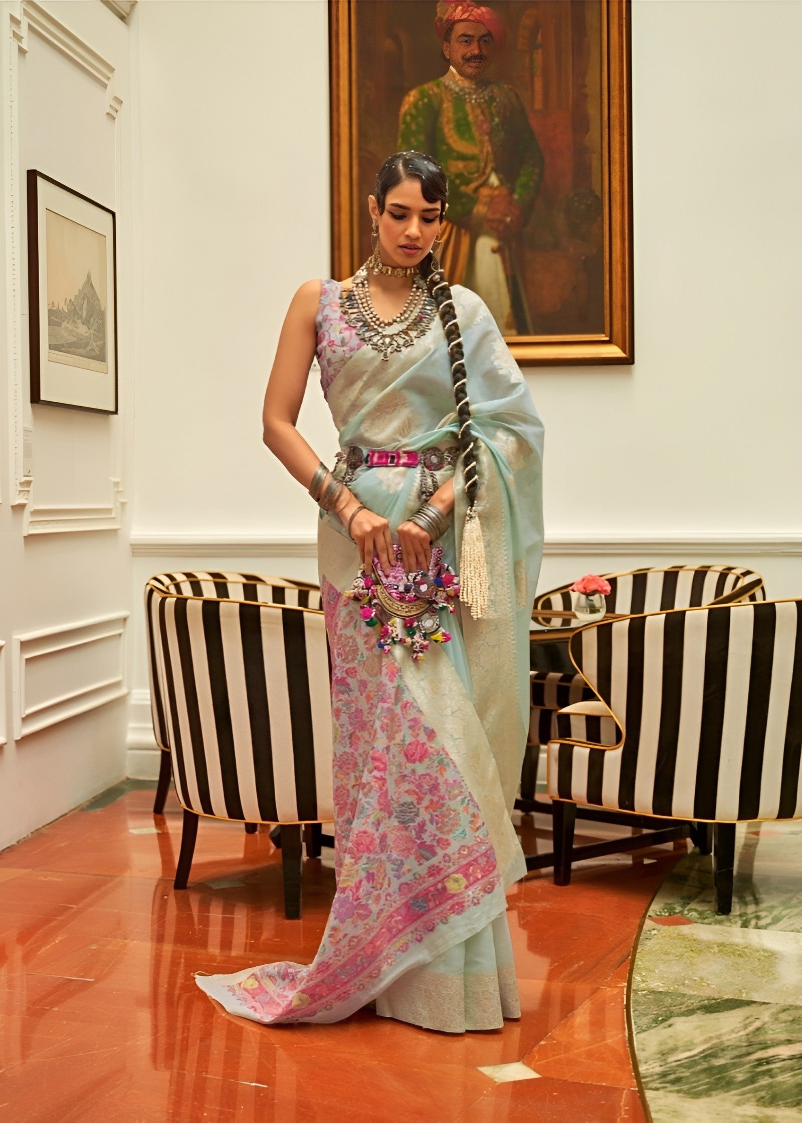 EKKTARA Saree For Women Light Blue Colour Handloom Weaving Silk Saree With Kashmiri Pallu & Kashmiri Unstitched Blouse