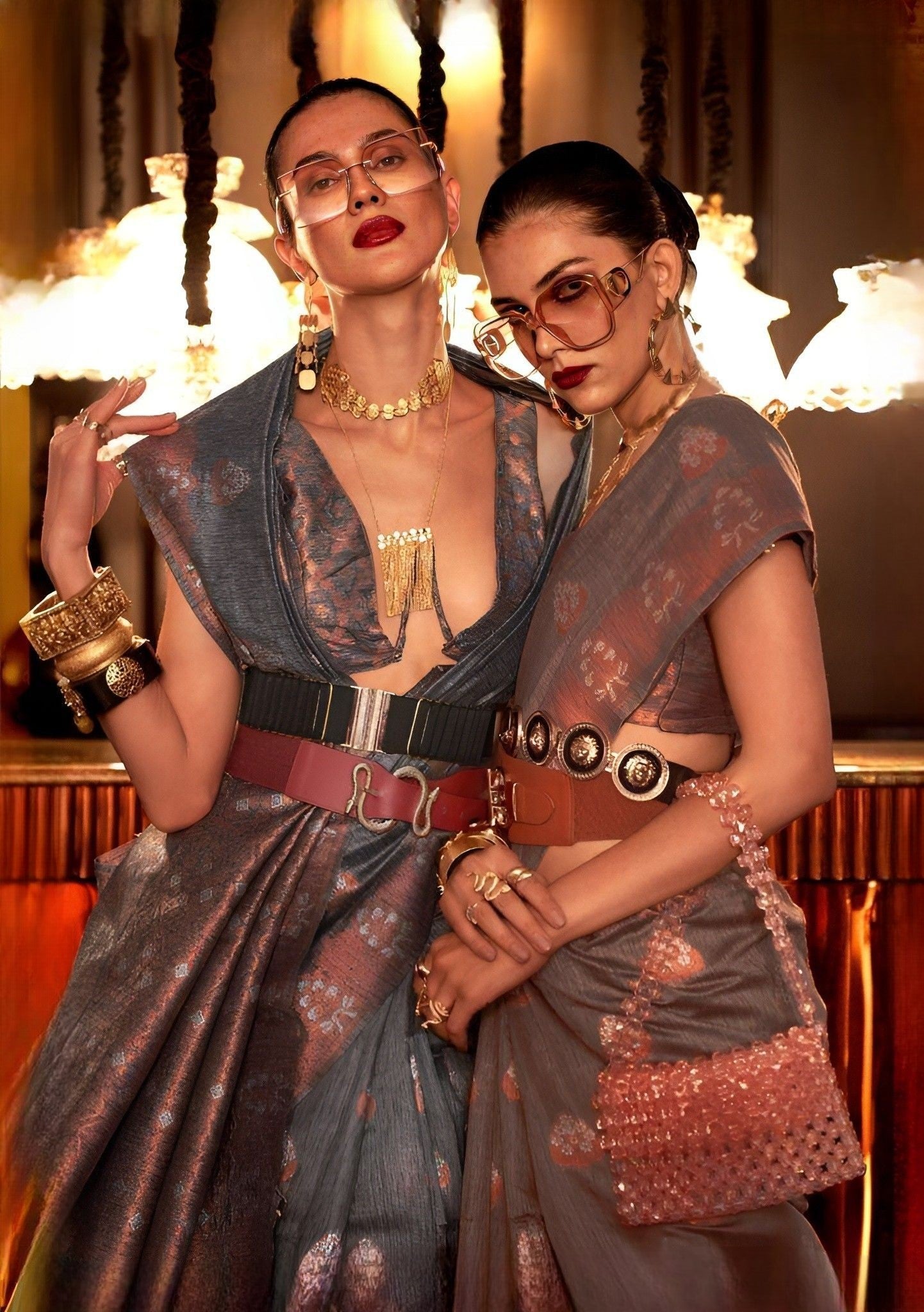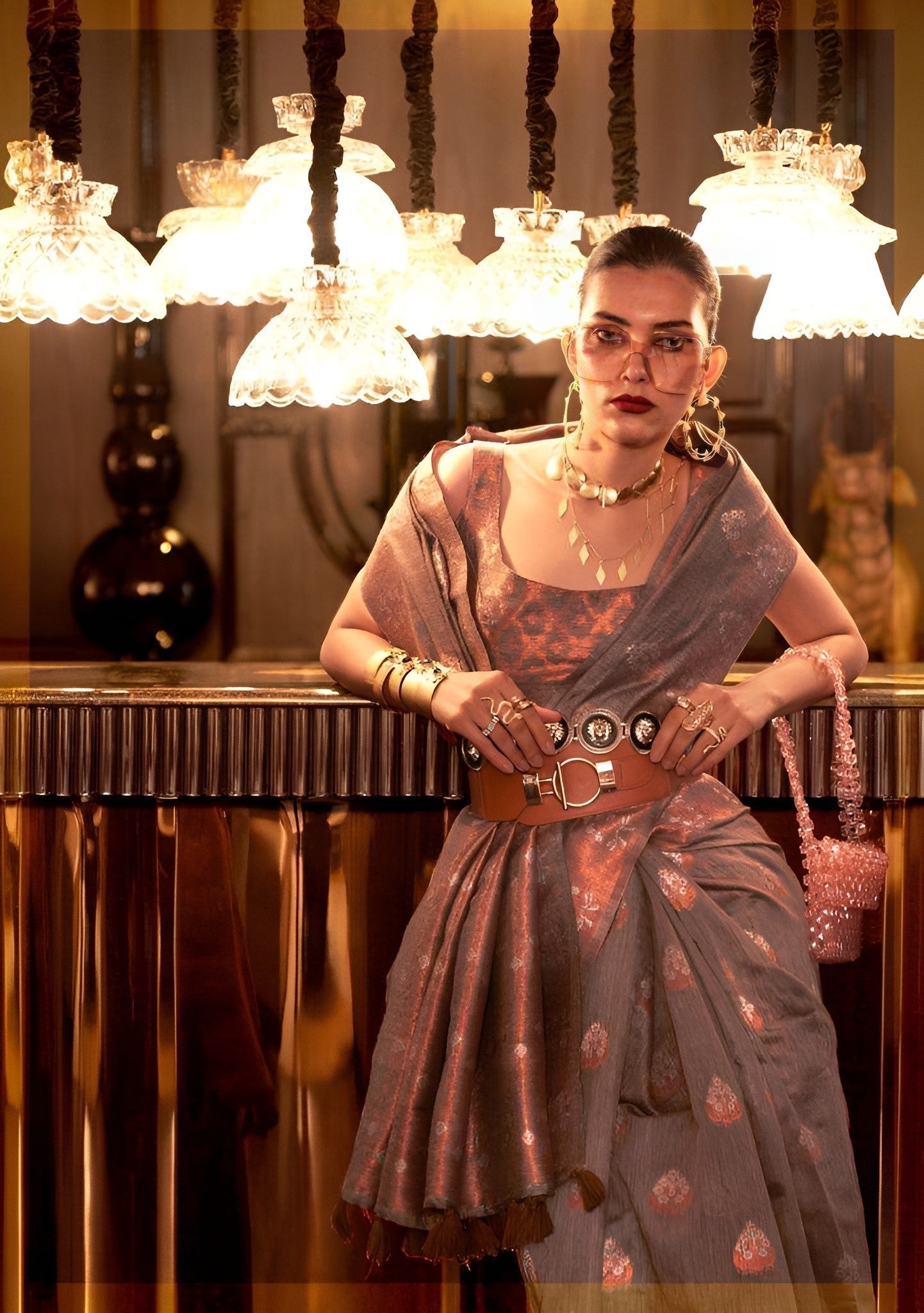 EKKTARA Saree For Women Light Brown Colour Linen Copper Zari Weaving Silk Saree With Unstitched Blouse