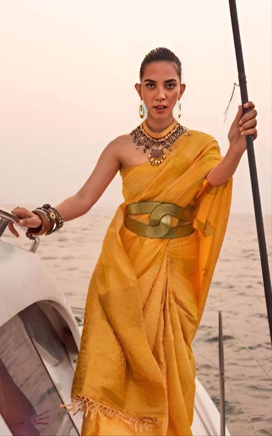 EKKTARA Saree For Women Amber Yellow Colour Satin Two Tone Handloom Weaving Saree With Unstitched Blouse