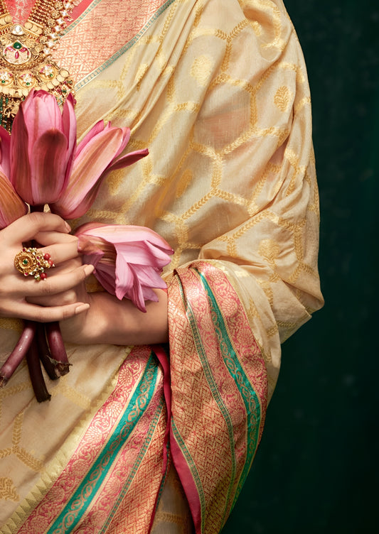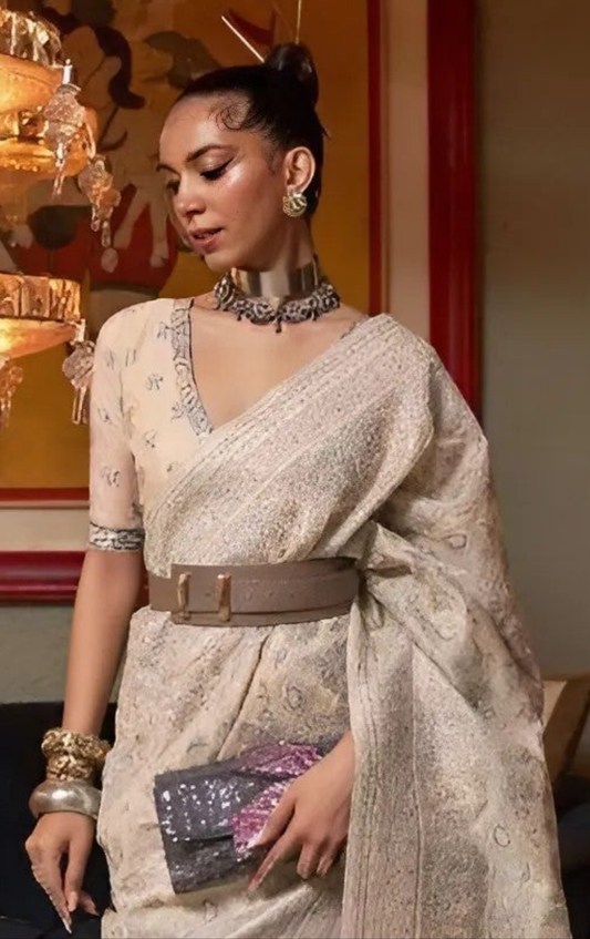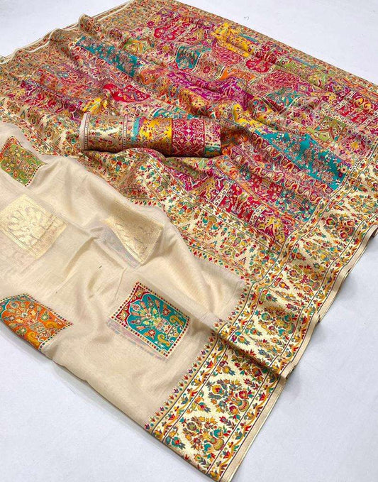 EKKTARA Saree For Women Beige Colour Kashmiri Silk Handloom Weaving Saree With Unstitched Blouse