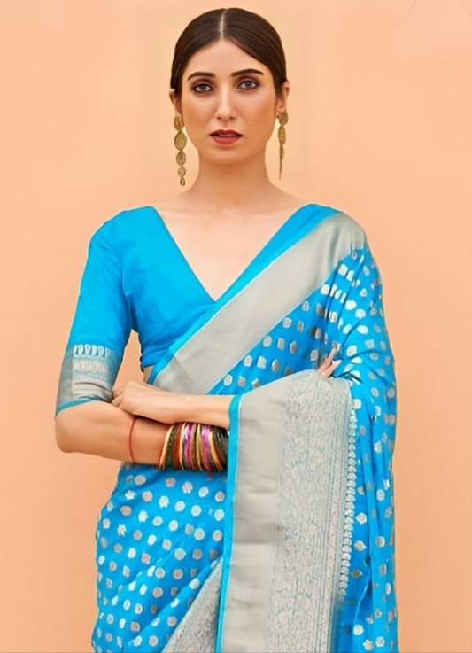 EKKTARA Saree For Women Azure Blue Colour Banarasi Silk Zari Saree With Unstitched Blouse