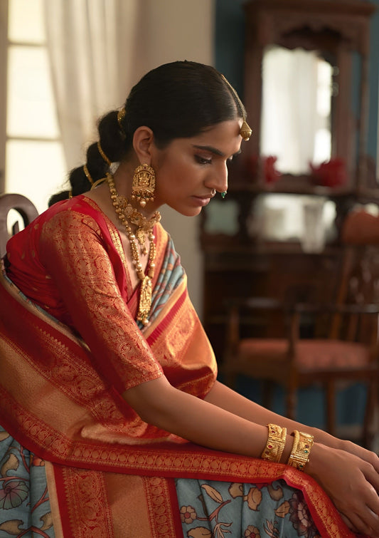 EKKTARA Saree For Women Sky Blue Colour Tusser Silk Kalamkari Print Saree With Contrast Unstitched Blouse