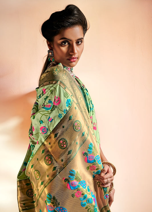 EKKTARA Saree For Women Pastel Light Green Designer Paithani Saree
