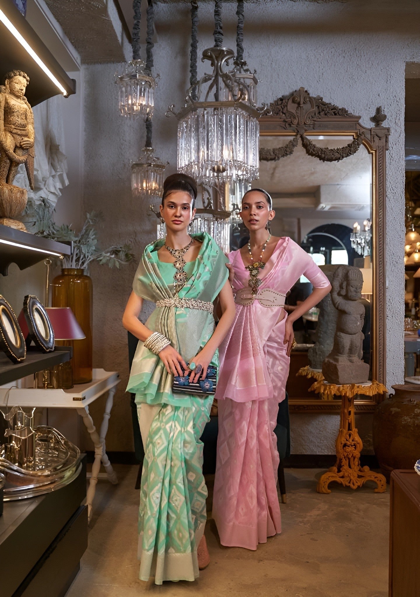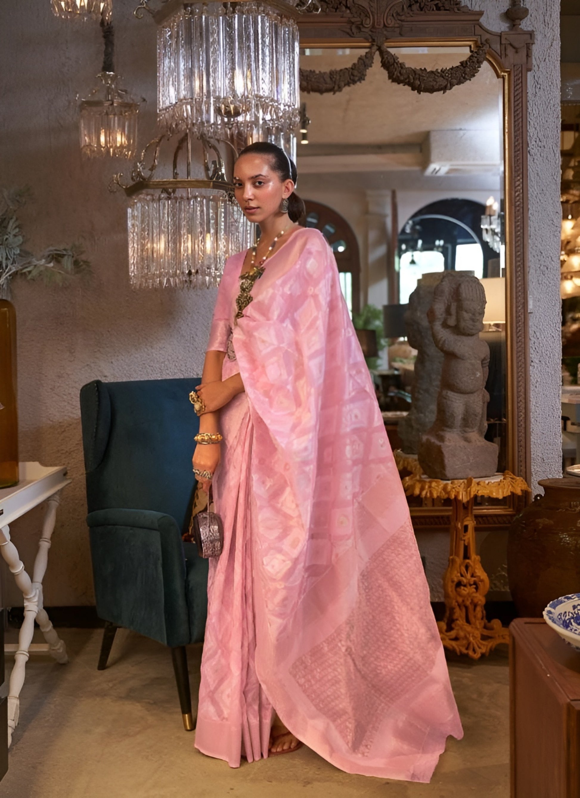 EKKTARA Saree For Women Light Pink Colour Pure Linen IKAT Handloom Weaving Saree With Unstitched Blouse