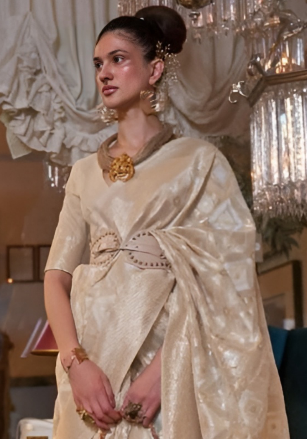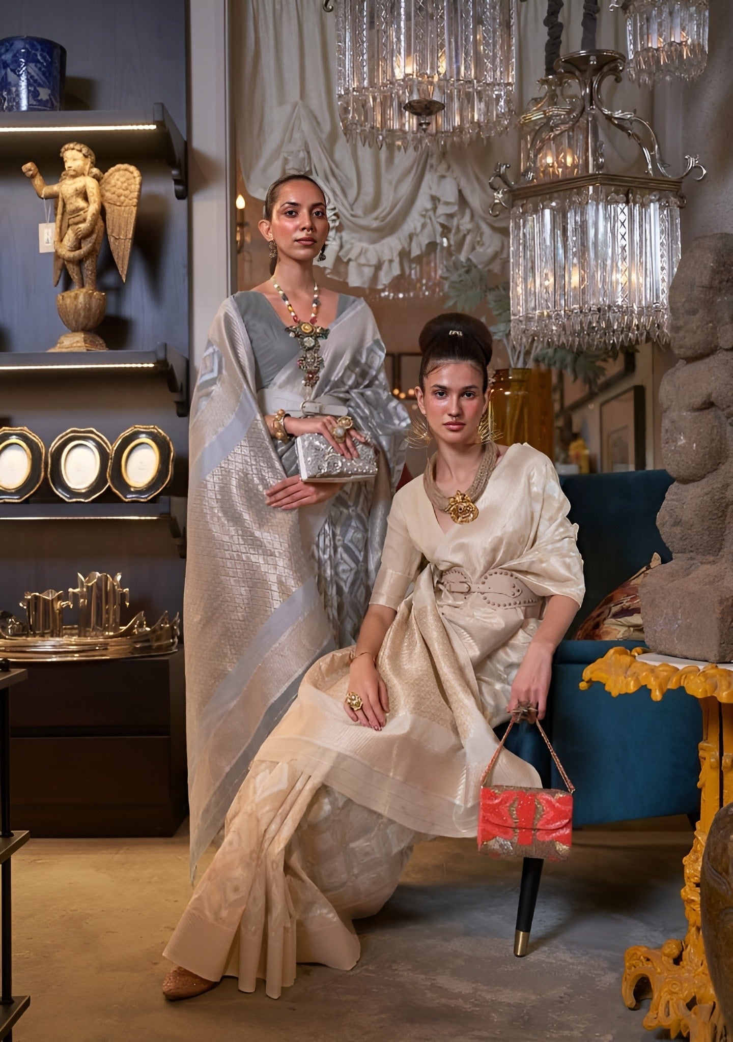 EKKTARA Saree For Women Beig Colour Pure Linen IKAT Handloom Weaving Saree With Unstitched Blouse