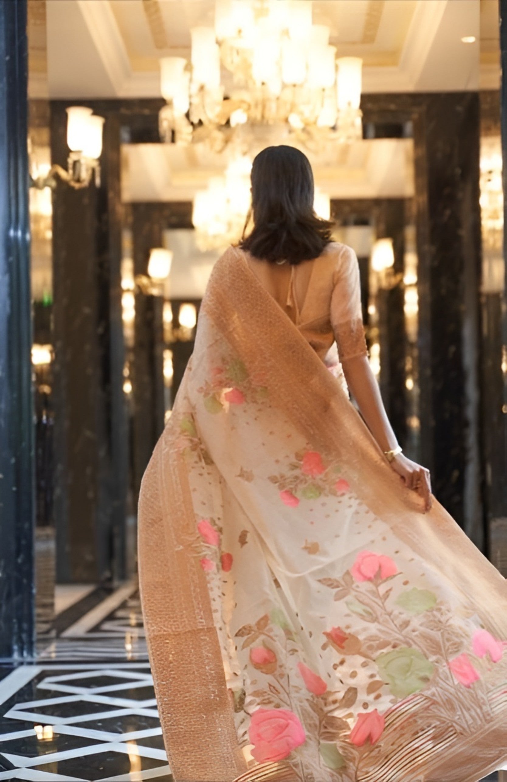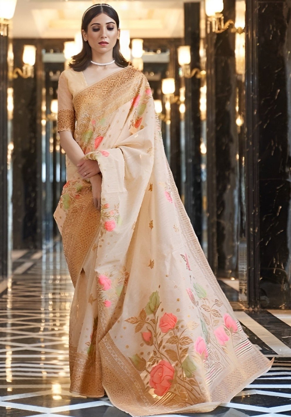 EKKTARA Saree For Women Beige Colour Linen Handloom Weaving Saree With Unstitched Blouse