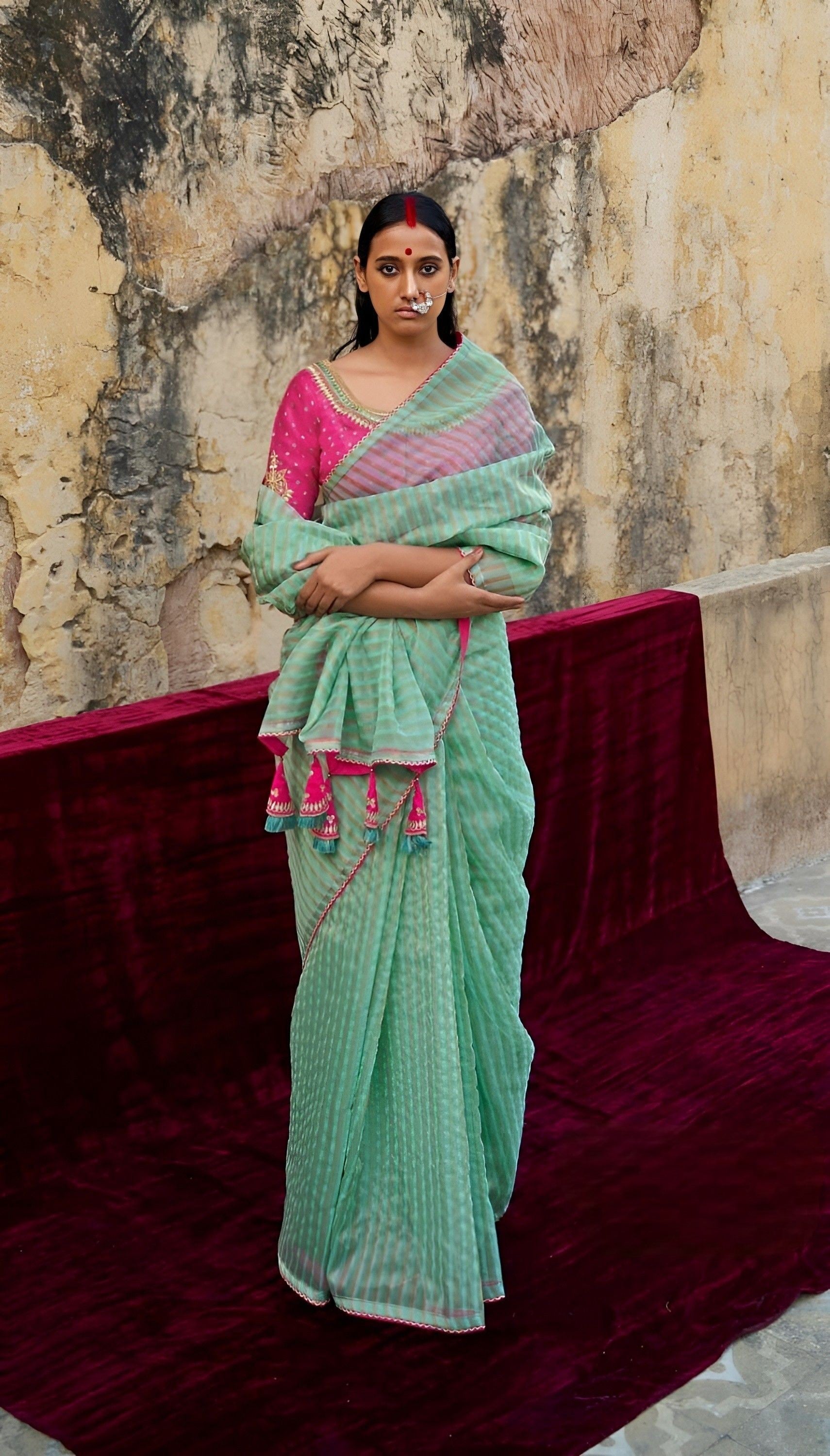EKKTARA Saree For Women Turquoise Colour Organza Sari Weaving Saree With Designer Unstitched Blouse