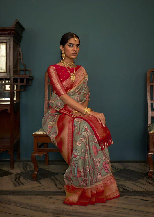 EKKTARA Saree For Women Grey Colour Tusser Silk Kalamkari Print Saree With Contrast Unstitched Blouse