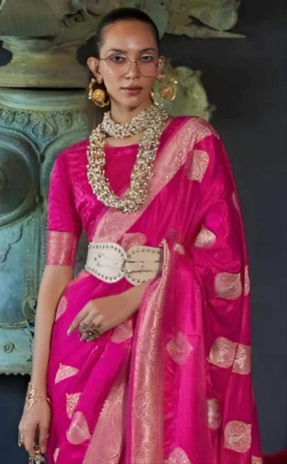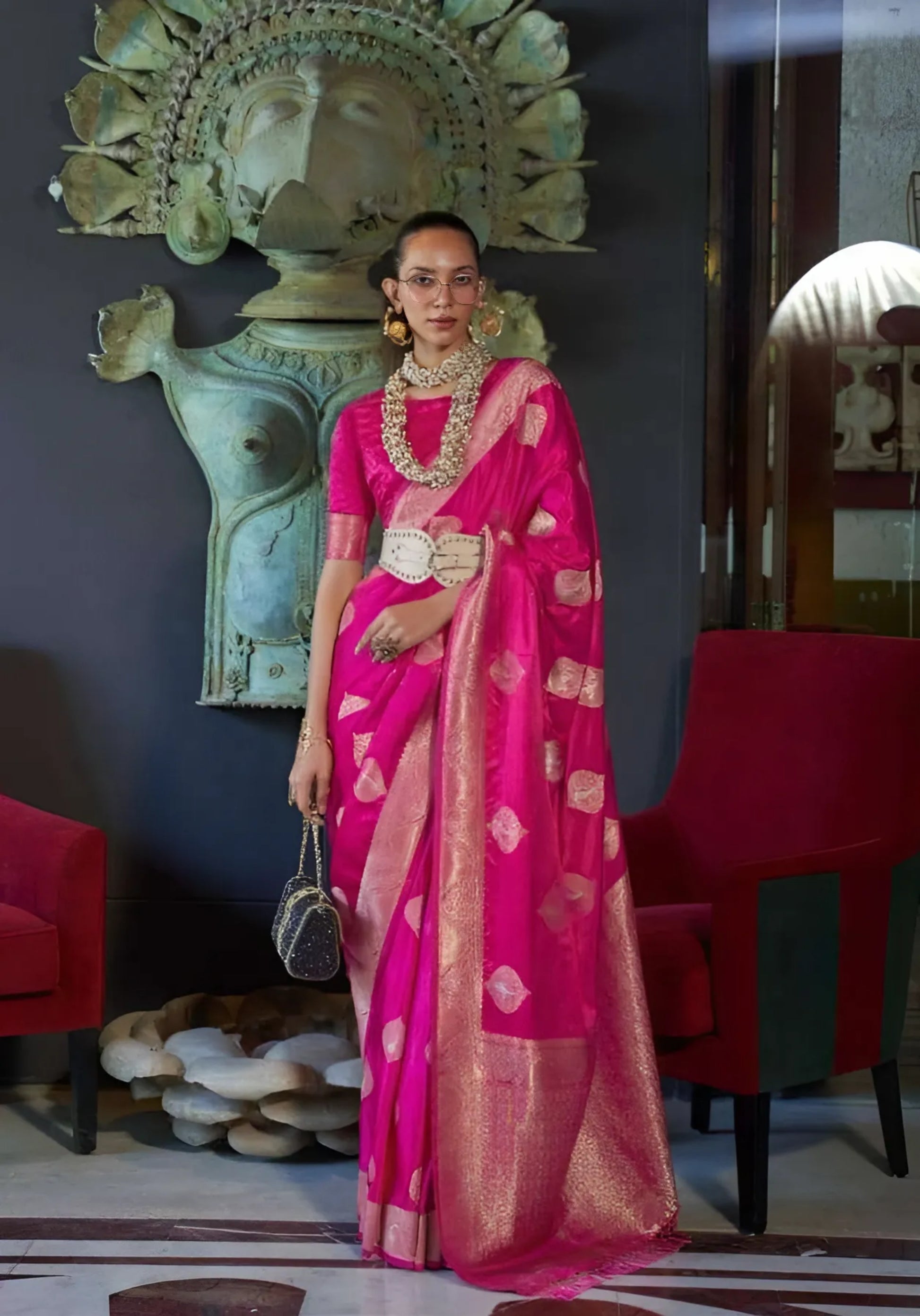 EKKTARA Saree For Women Deep Pink Colour Nylon Satin Handloom Weaving Saree With Unstitched Blouse
