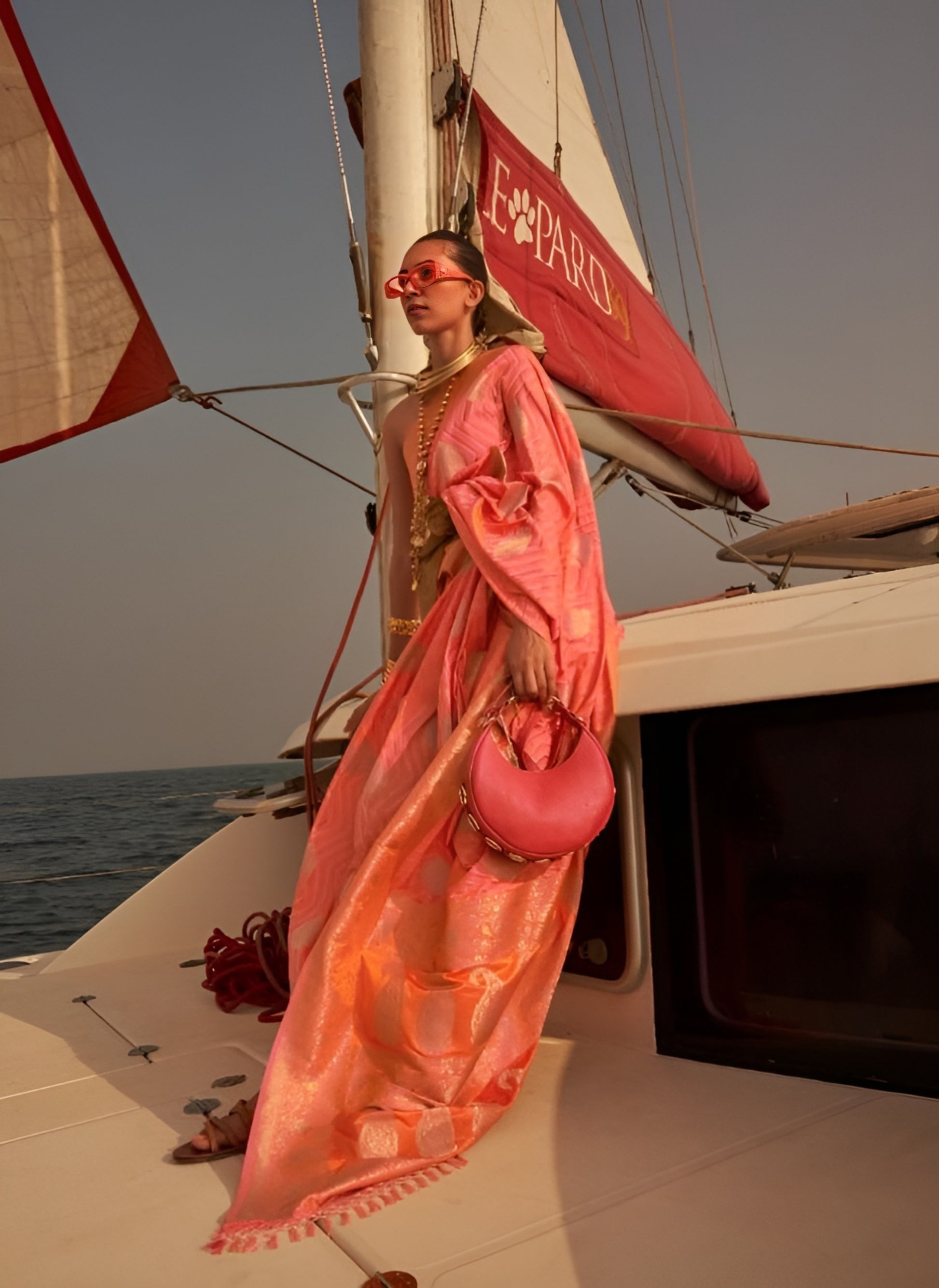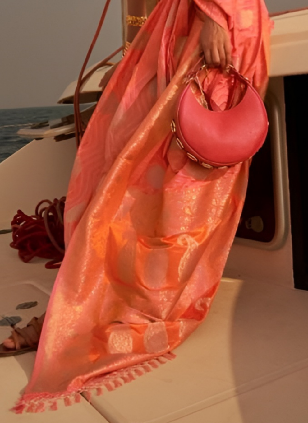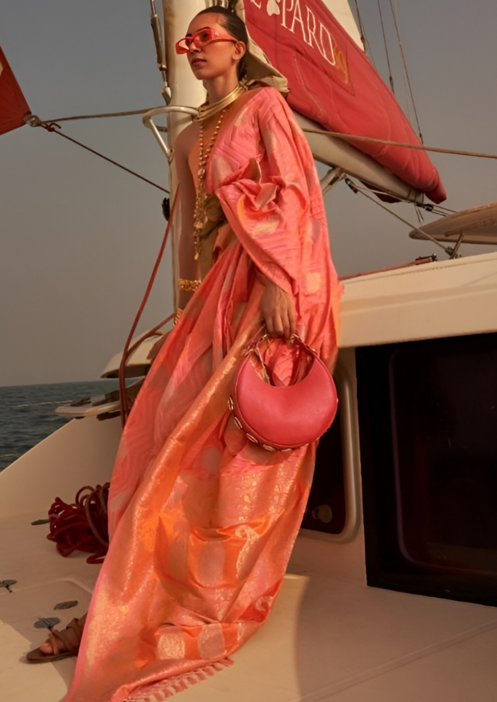 EKKTARA Saree For Women Orange Two Tone Handloom Weaving Satin Silk Saree
