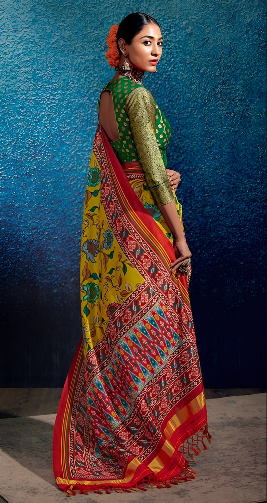EKKTARA Saree For Women Yellow Colour Tusser Silk Kalamkari Print Saree With Unstitched Blouse