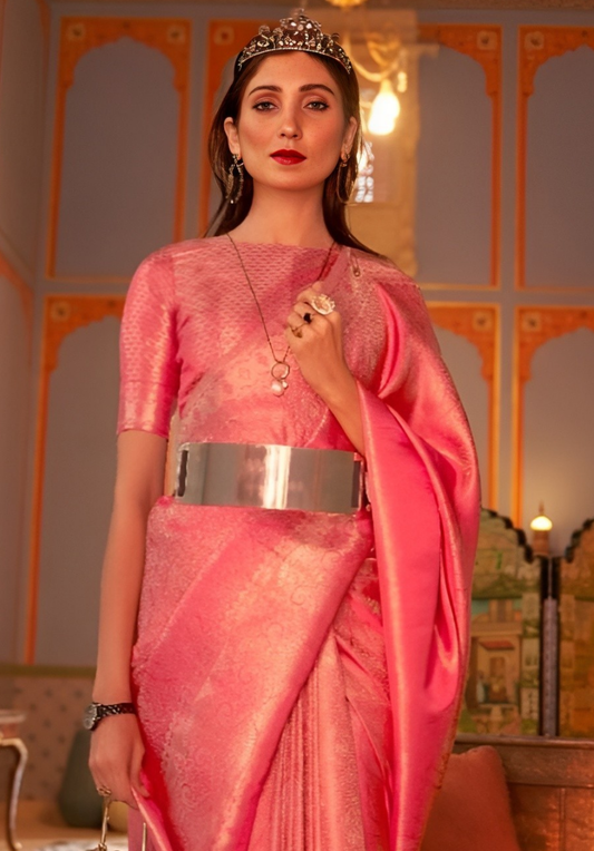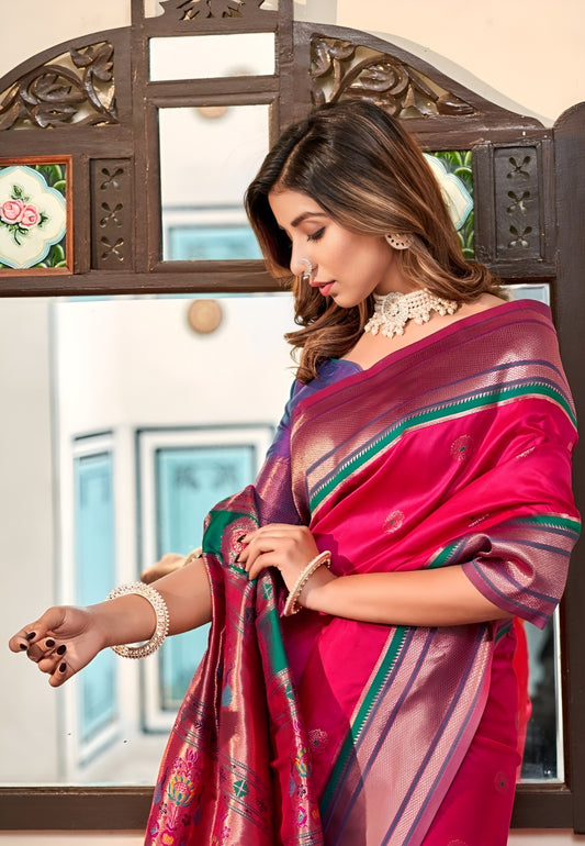 EKKTARA Saree For Women Pink Colour Peshwai Paithani Silk Saree With Unstitched Blouse