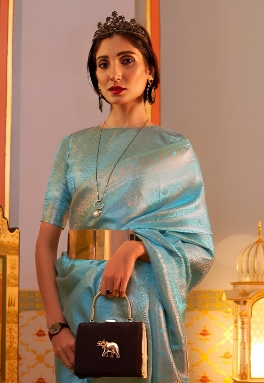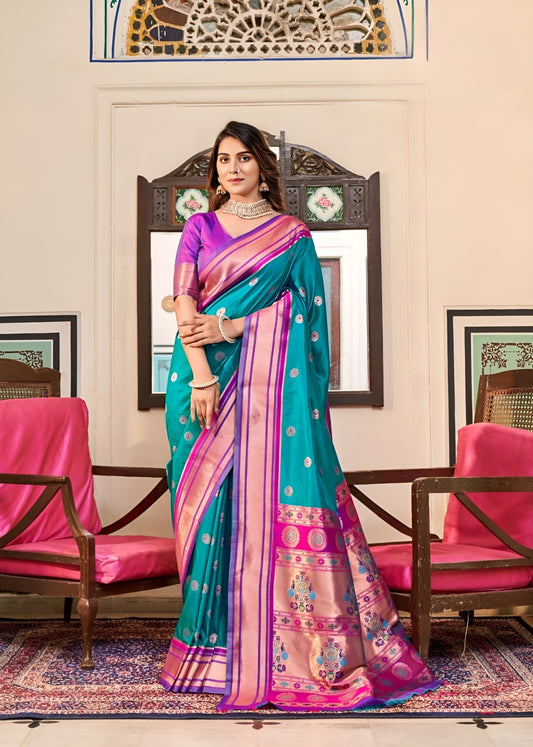 EKKTARA Saree For Women Turquoise Colour Peshwai Paithani Silk Saree With Unstitched Blouse