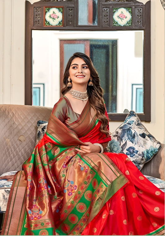 EKKTARA Saree For Women Red Colour Peshwai Paithani Silk Saree With Unstitched Blouse