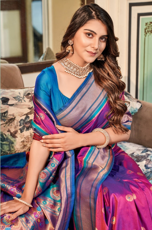 EKKTARA Saree For Women Purple Colour Peshwai Paithani Silk Saree With Unstitched Blouse