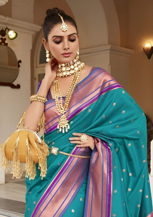EKKTARA Saree For Women Turquoise Colour Peshwai Paithani Silk Saree With Unstitched Blouse