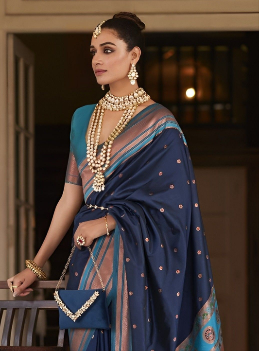 EKKTARA Saree For Women Navy Blue Colour Peshwai Paithani Silk Saree With Unstitched Blouse