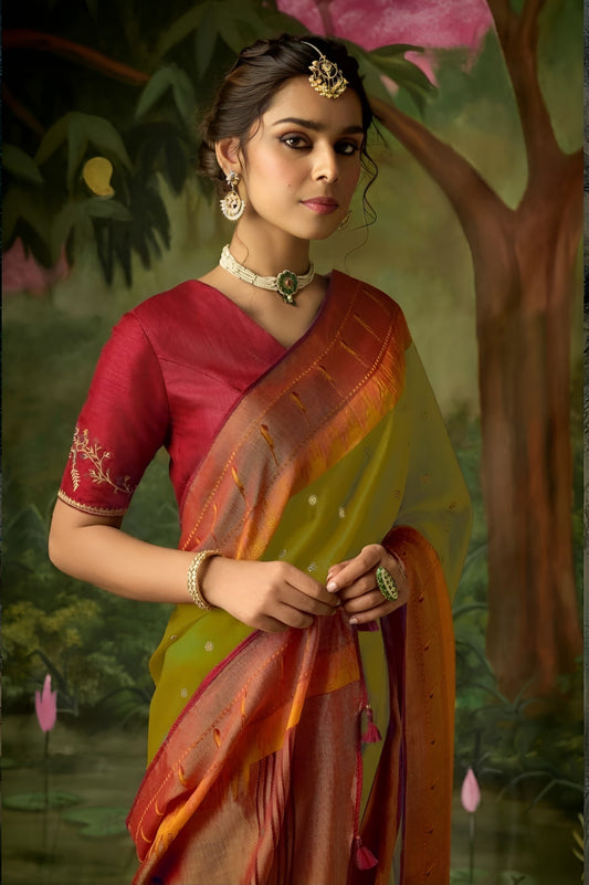 EKKTARA Saree For Women Olive Green Brasso Silk Designer Paithani Saree