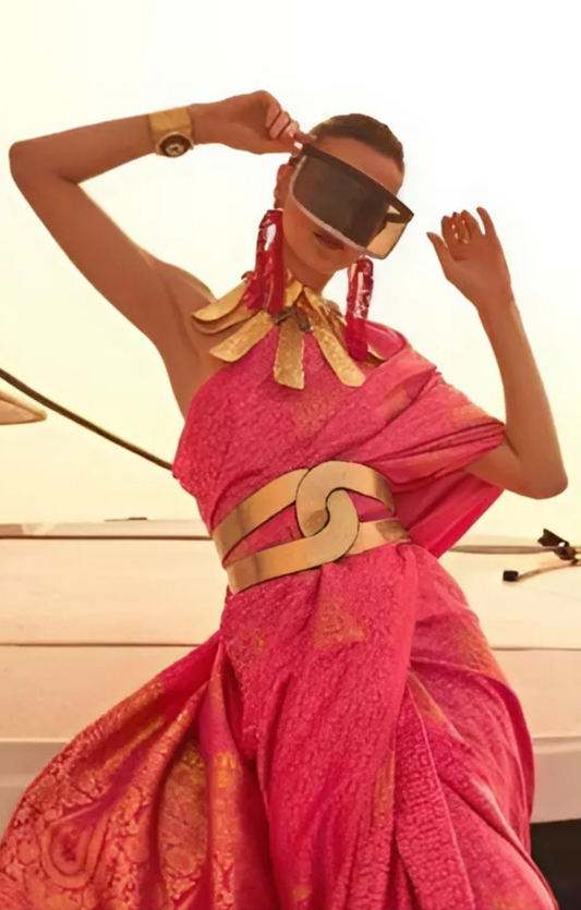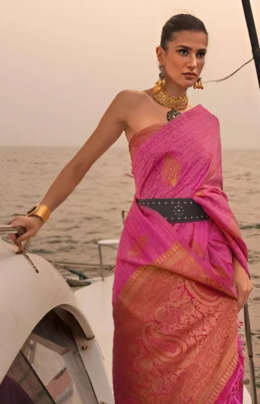 EKKTARA Saree For Women Pink Colour Pure Satin Handwoven Saree With Zari Weaving And Unstitched Blouse