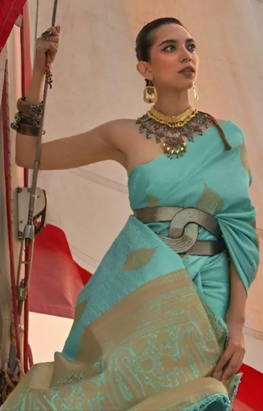EKKTARA Saree For Women Turquoise Colour Satin Two Tone Handloom Weaving Saree With Unstitched Blouse