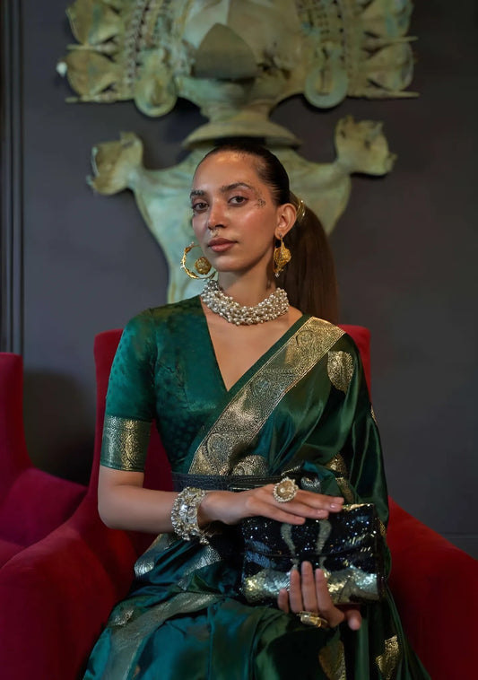 EKKTARA Saree For Women Dark Green Colour Pure Satin Silk Handloom Weaving Saree With Unstitched Blouse