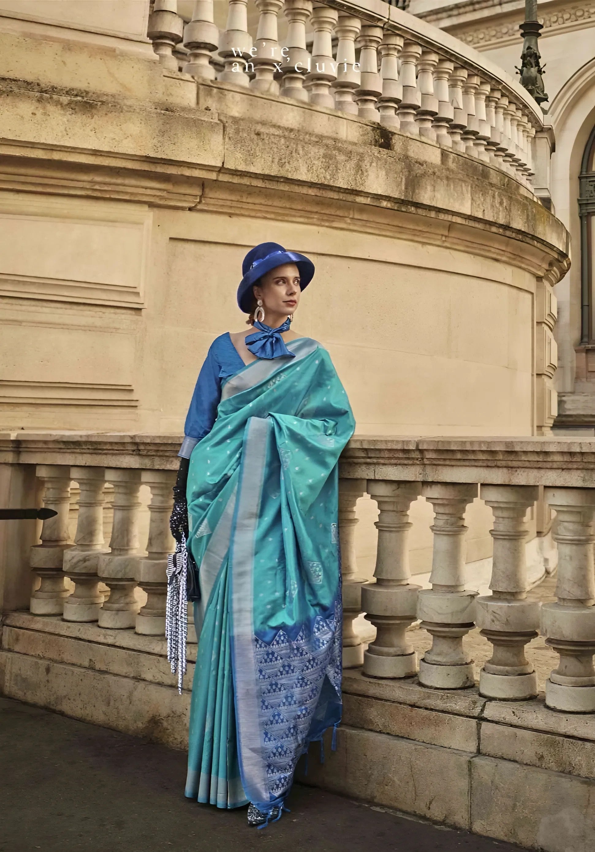 EKKTARA Saree For Women Turquoise Colour Soft Silk Handloom Weaving Saree With Unstitched Blouse