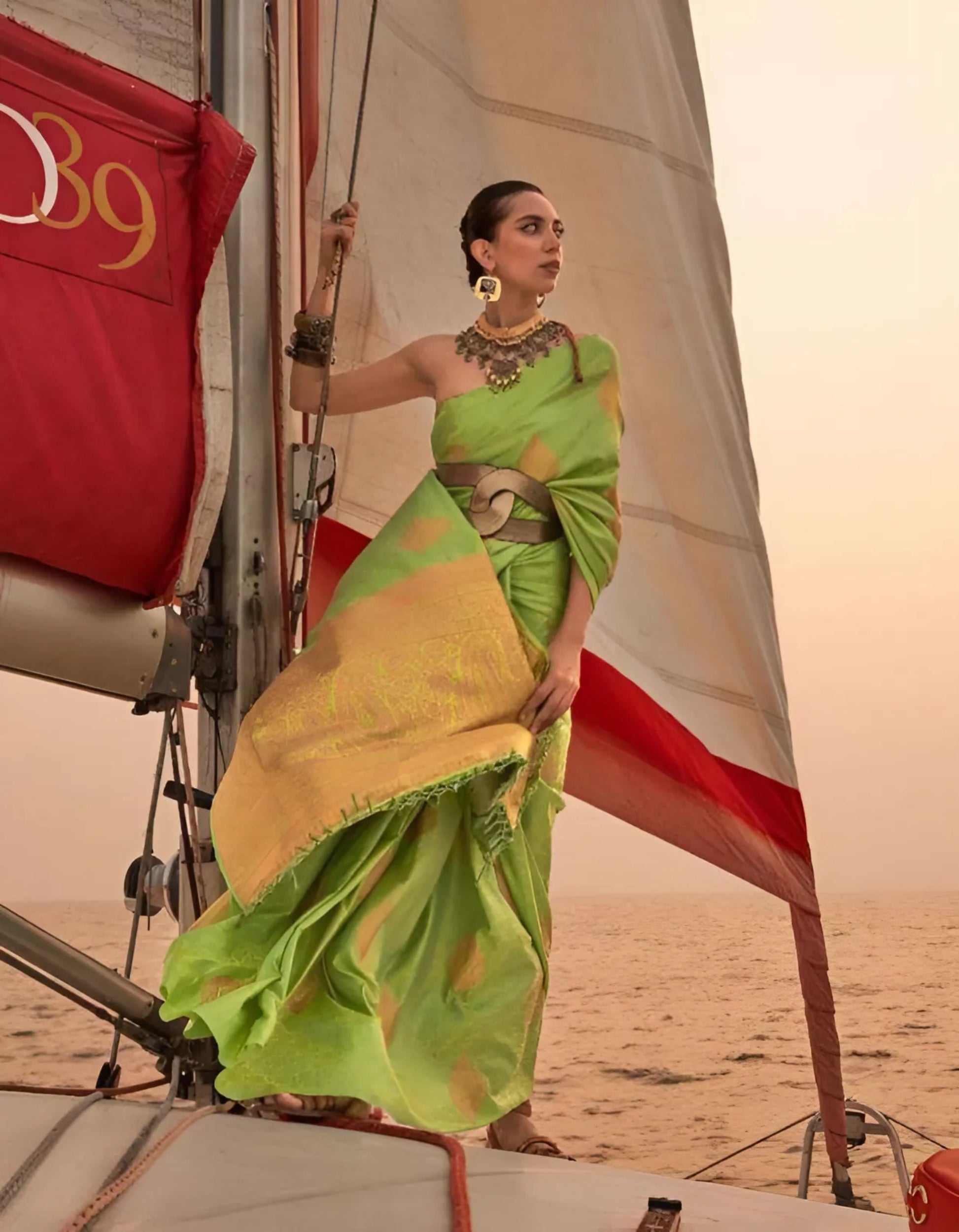 EKKTARA Saree For Women Parrot Green Colour Satin Two Tone Handloom Weaving Saree With Unstitched Blouse