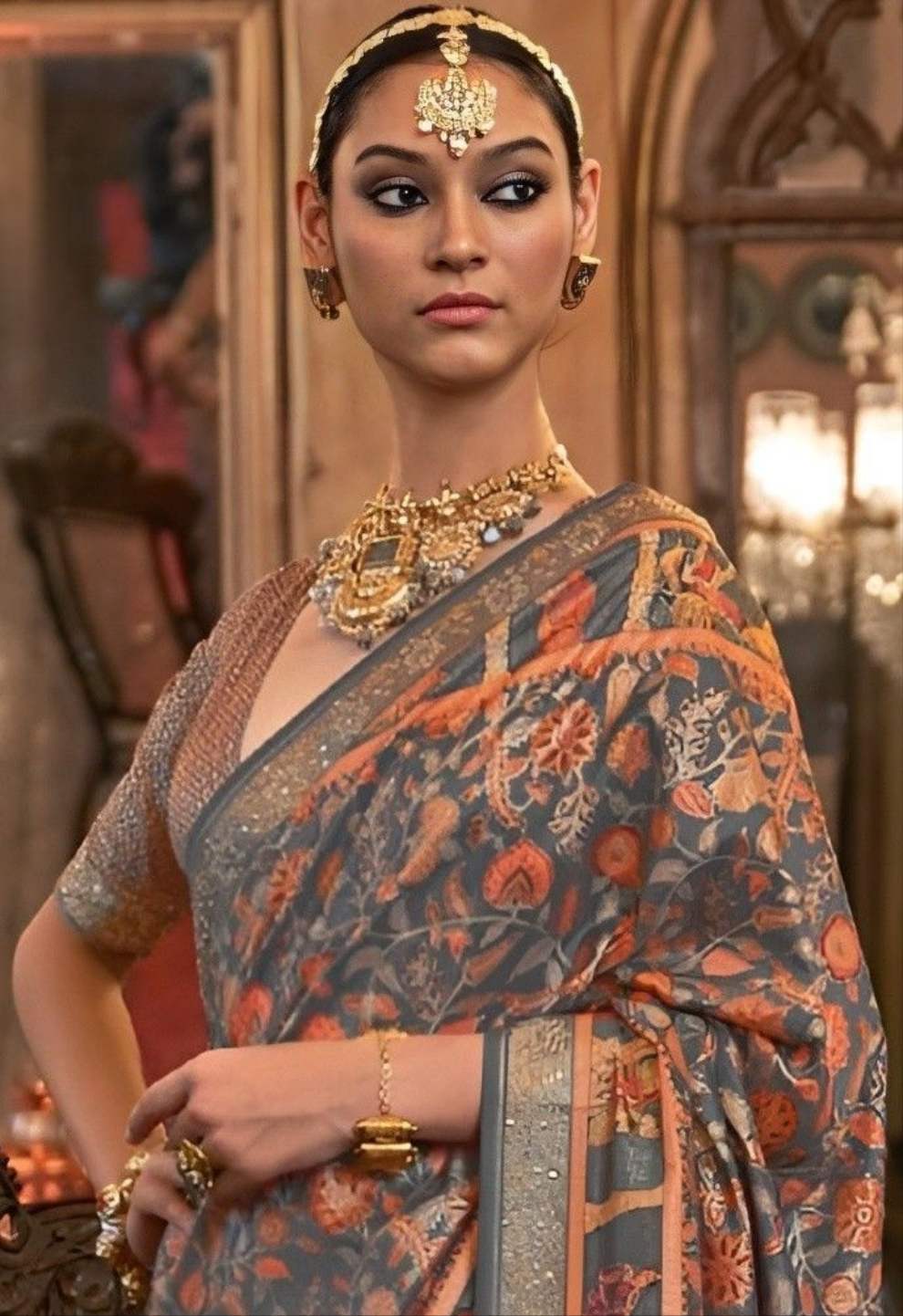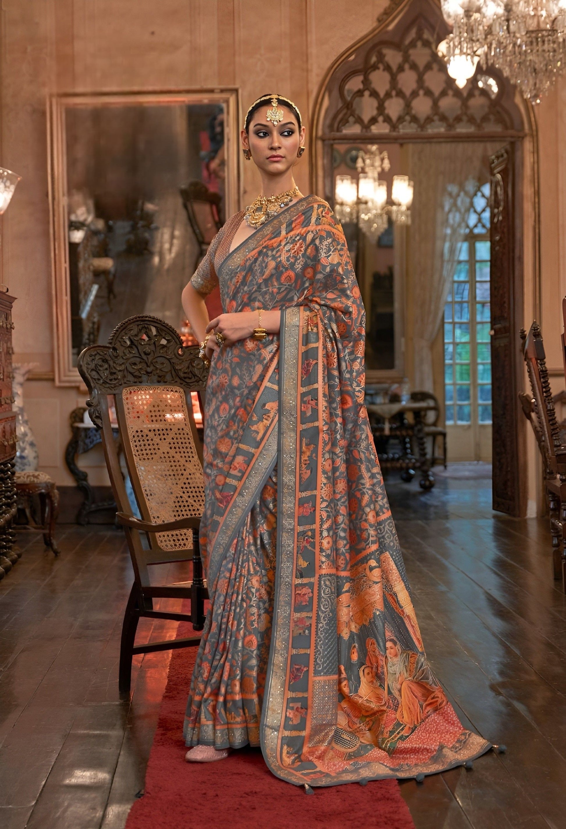 EKKTARA Saree For Women Grey Colour Patola Weaving Saree With Unstitched Blouse