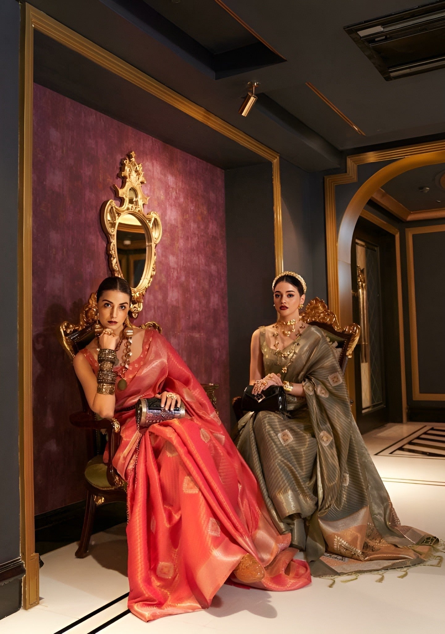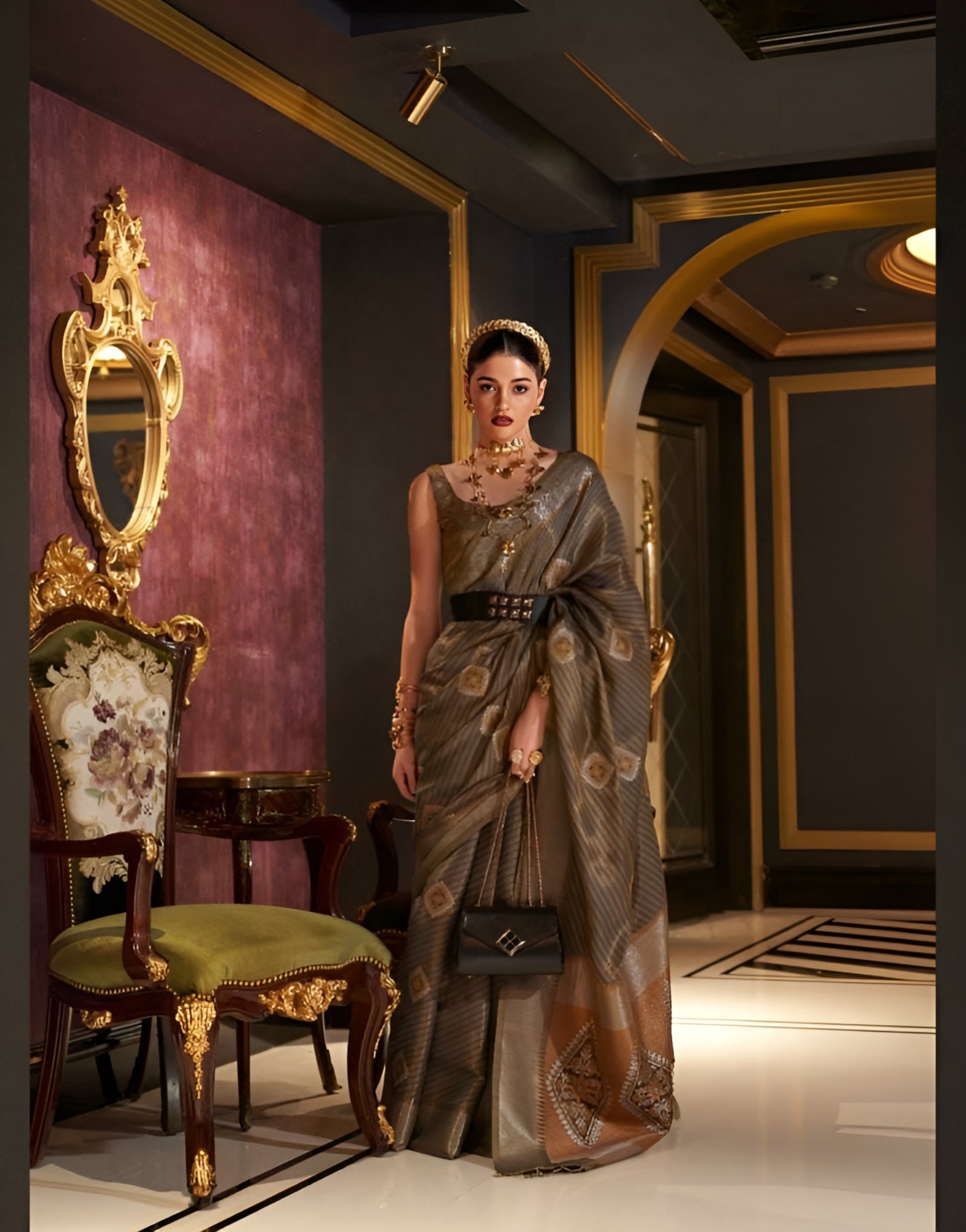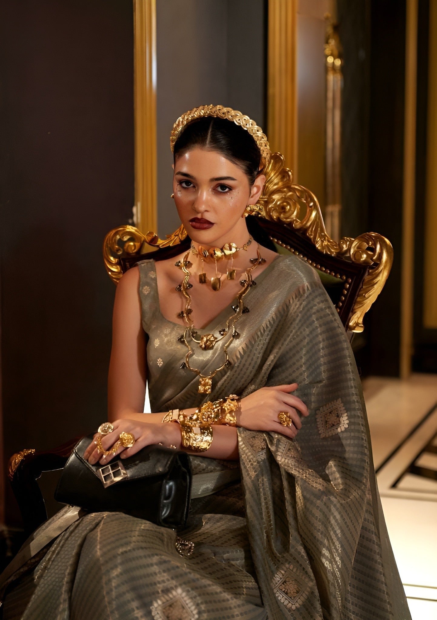 EKKTARA Saree For Women Grey Colour Zari Banarasi Handloom Weaving Silk Saree With Unstitched Blouse