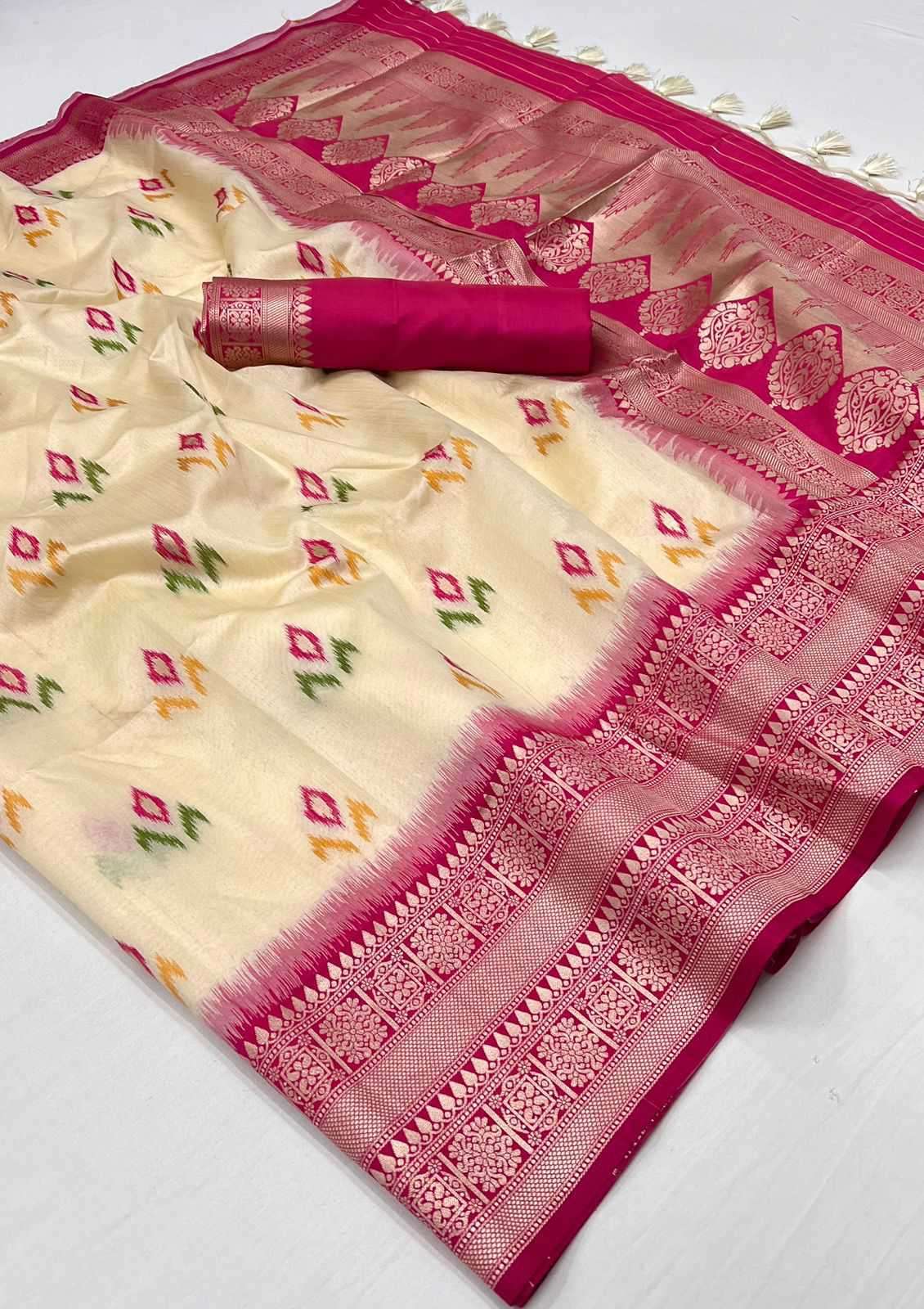 EKKTARA Saree For Women Cream Colour Silk Handloom Weaving Saree With Unstitched Blouse