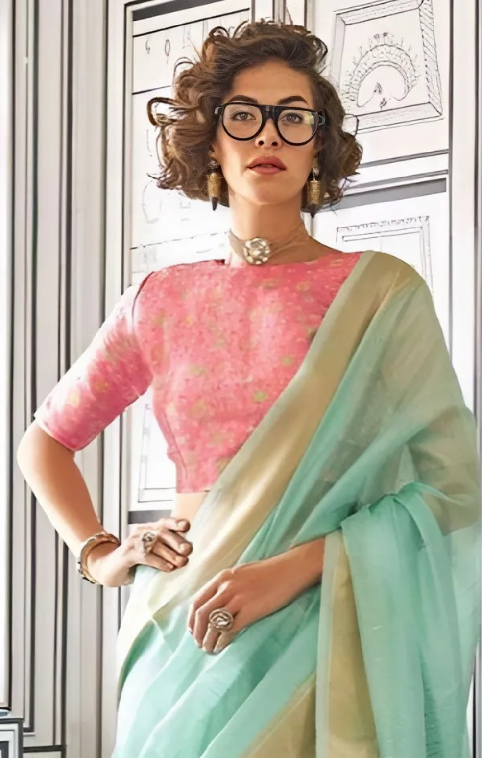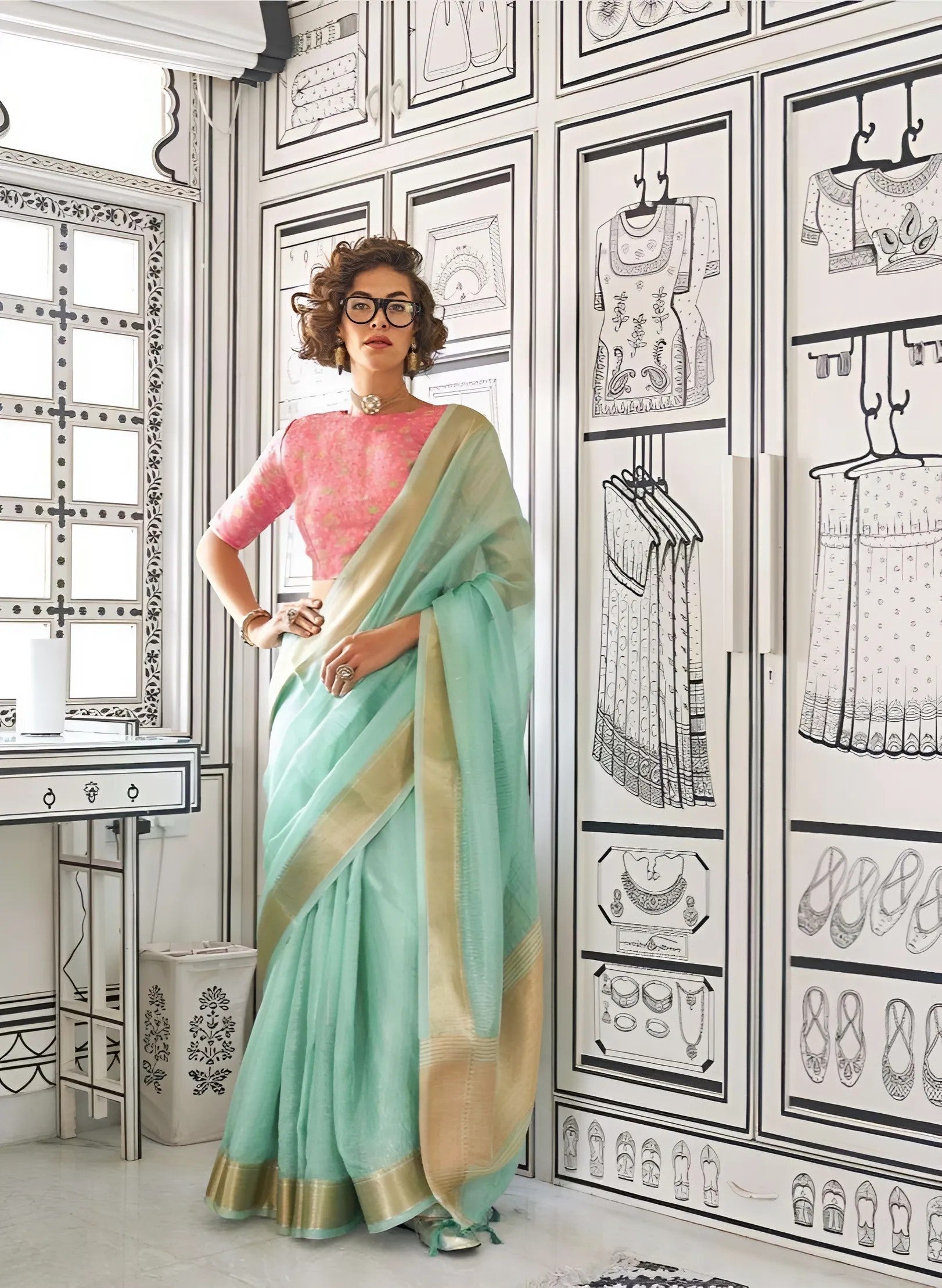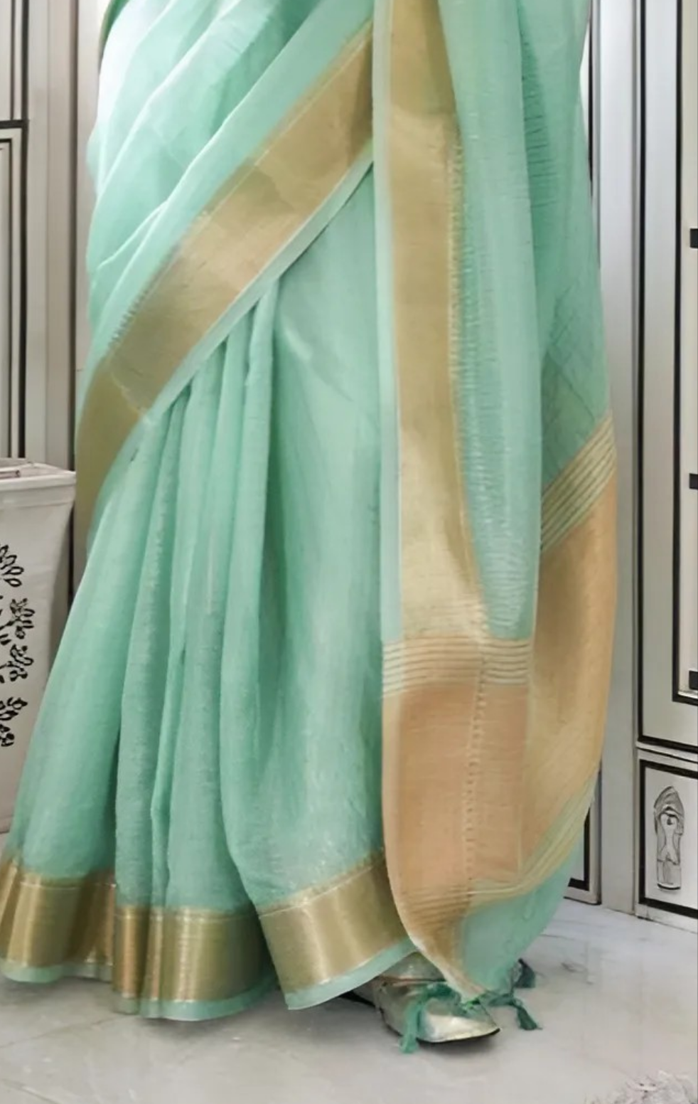 EKKTARA Saree For Women Turquoise Colour Moss Chiffon Handloom Weaving Saree With Unstitched Blouse