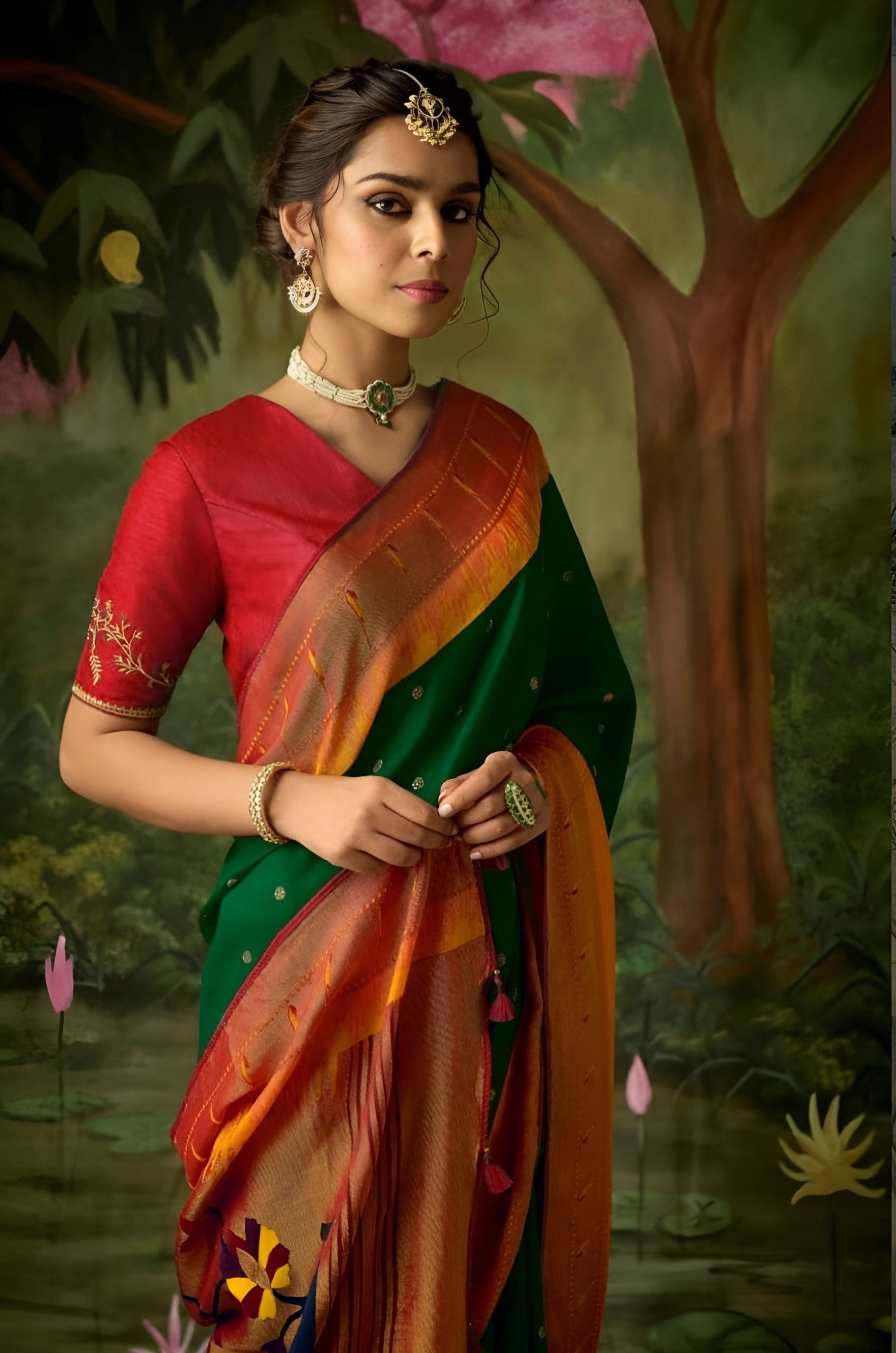EKKTARA Saree For Women Green Brasso Silk Designer Paithani Saree