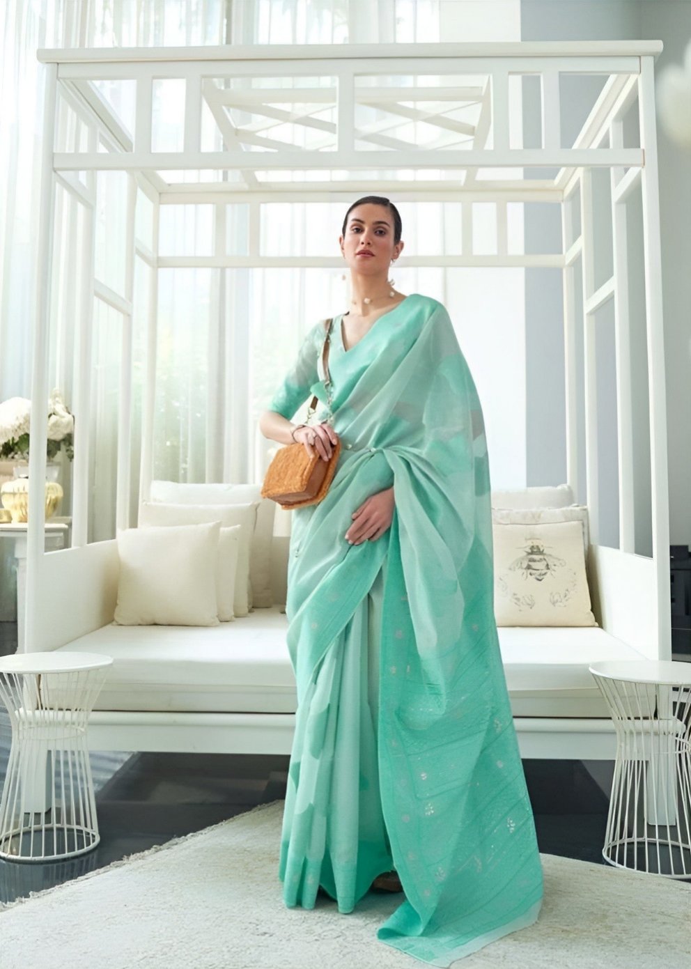 EKKTARA Saree For Women Celeste Turquoise Chikankari Lucknowi Weaving Saree