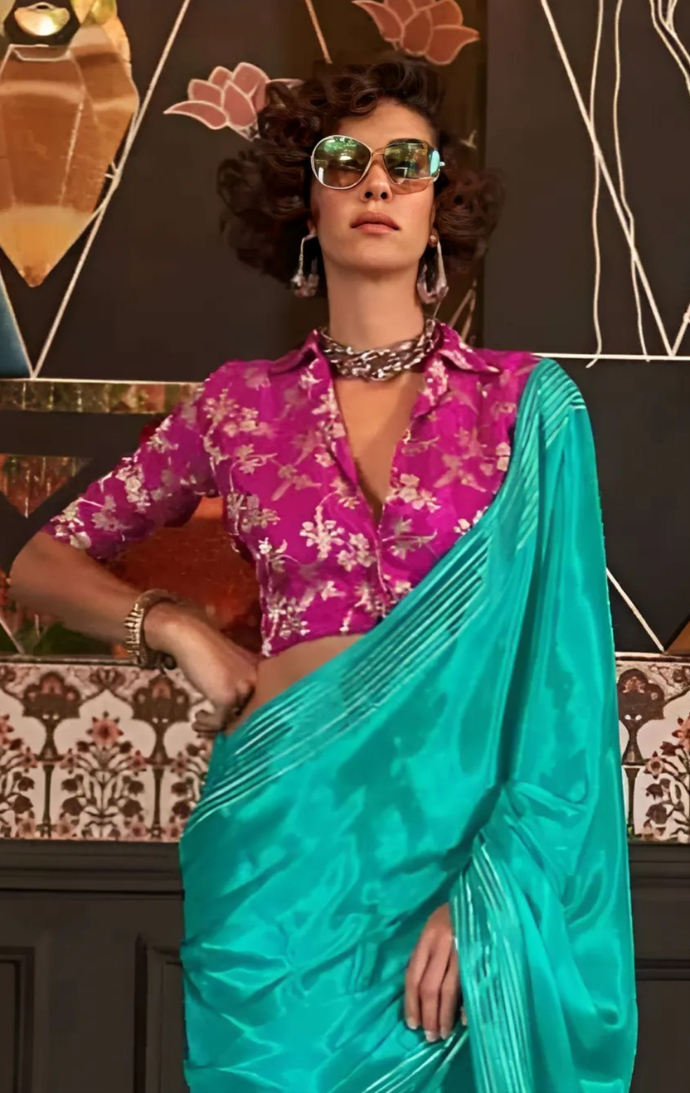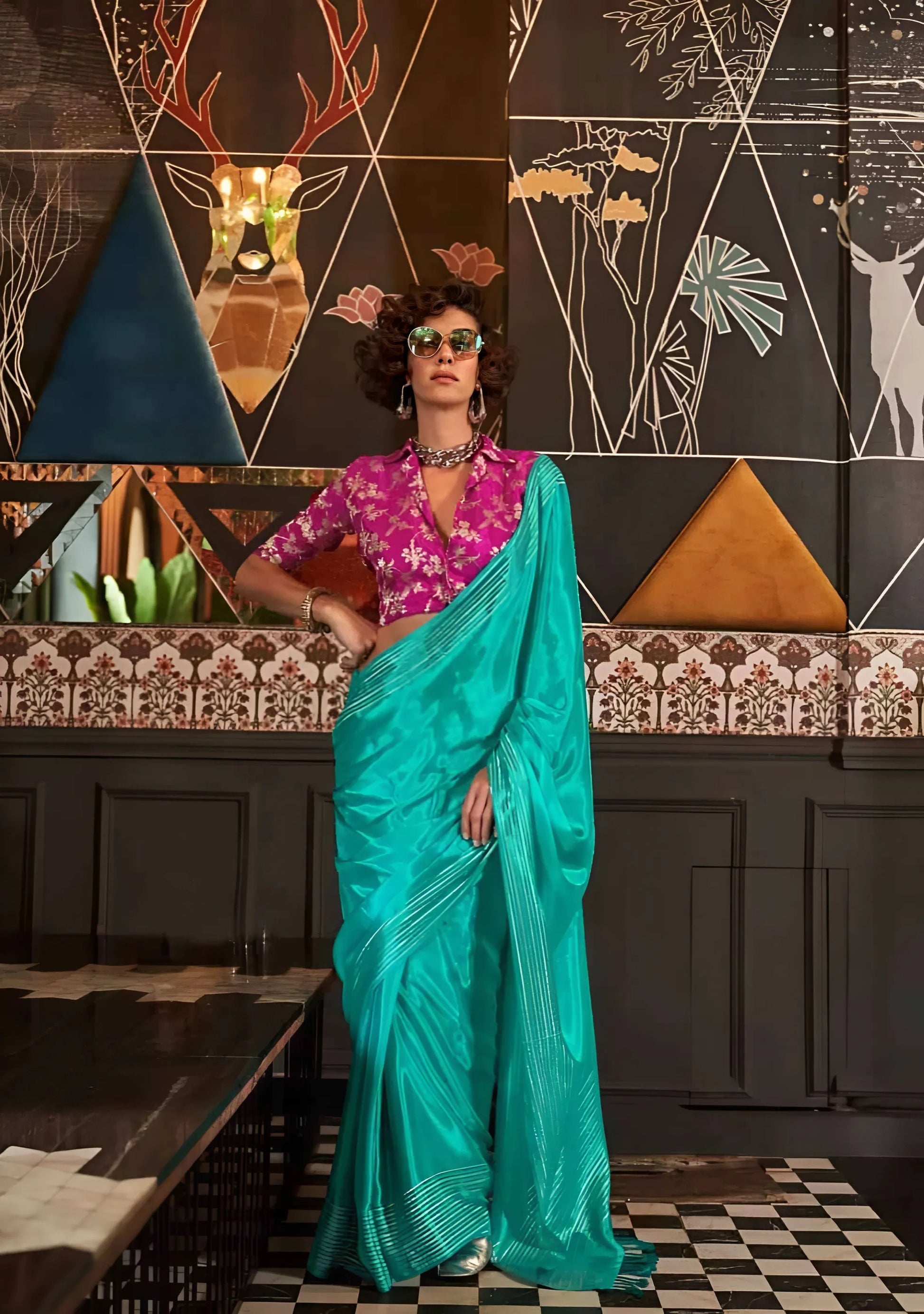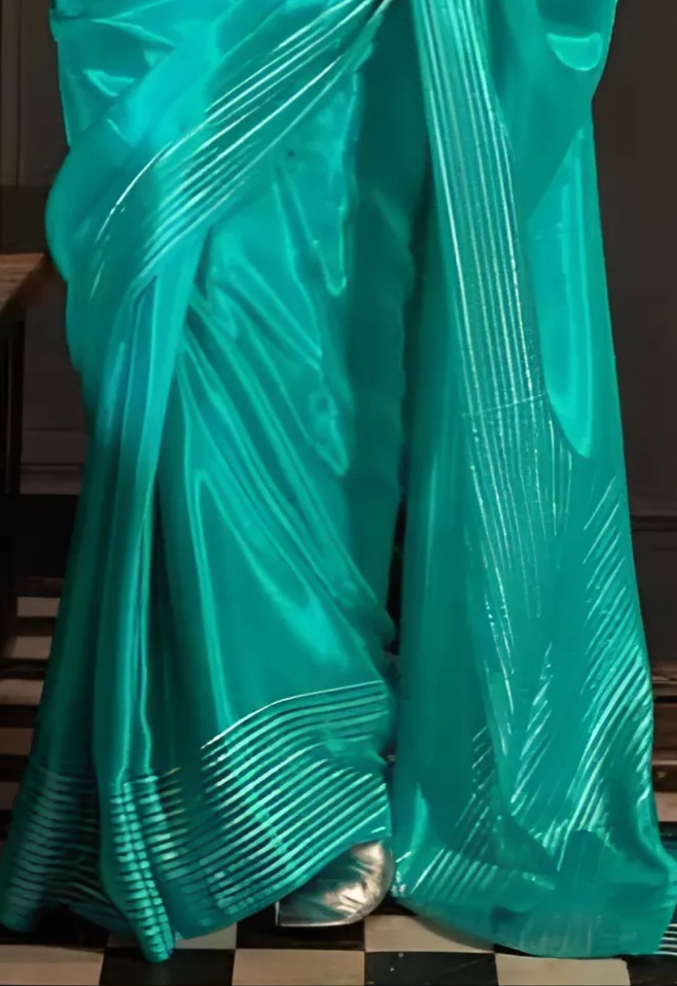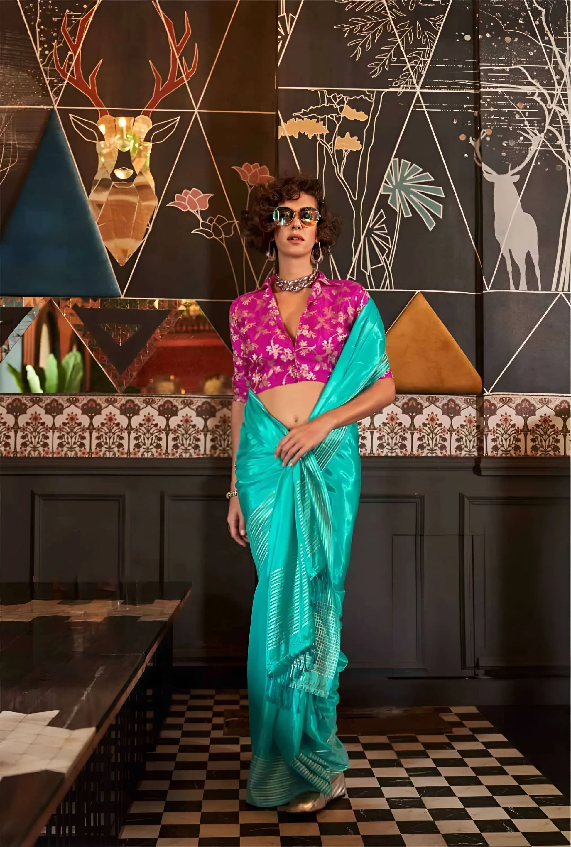EKKTARA Saree For Women Turquoise Colour Party Wear Designer Handloom Weaving Saree With Unstitched Blouse